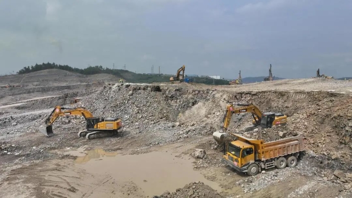 前期爆破剝離工序后,徐工20噸挖掘機(jī)搭配140的小破碎錘進(jìn)行二破,同時(shí)XE380GK、XE600GK等機(jī)型進(jìn)行挖裝作業(yè)?,F(xiàn)場(chǎng)共投入挖掘機(jī)50多臺(tái),每天的挖方量在10萬方左右。