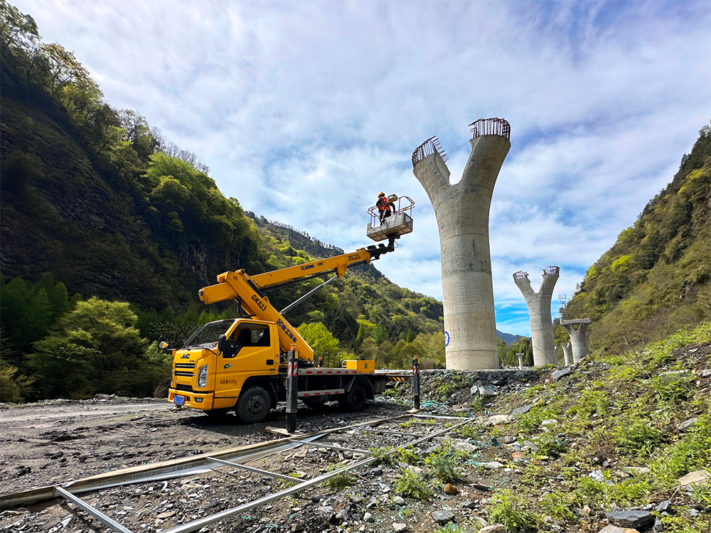 施工環(huán)境惡劣,工期艱巨,徐工GKS23B高空作業(yè)車最大作業(yè)高度22.8m,最大作業(yè)幅度14.6m,采用新型高強度超薄鋼材,完美駕馭川西石礫沙地的施工環(huán)境,憑借穩(wěn)定、高效的舉升性能,出色完成橋墩施工任務,將藍牌產(chǎn)品各項作業(yè)性能發(fā)揮到極致。