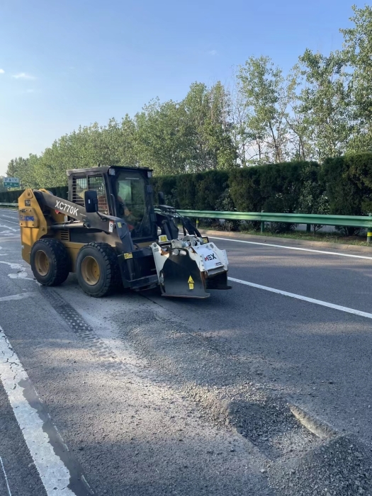 徐工滑移裝載機(jī)搭配銑刨器高速公路坑槽病害快速銑刨,預(yù)留臺(tái)階,便于分層壓實(shí)和提升路基結(jié)構(gòu)穩(wěn)定。