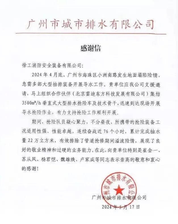 近日,徐工消防收到一封來自廣州市城市排水有限公司的感謝信,信中熱忱感謝徐工在廣州市海珠區(qū)某地地面坍塌險情中提供的高效、專業(yè)的設備及人員支持。