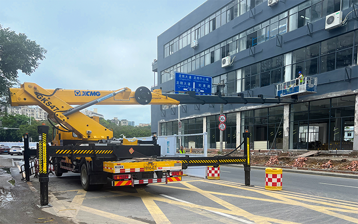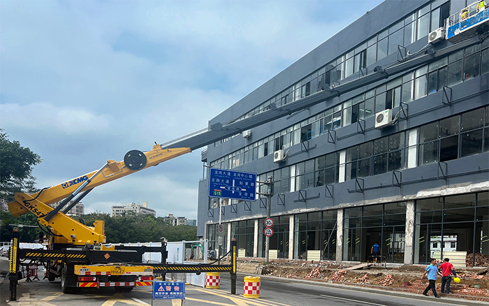 近日,一臺(tái)GKS47高空作業(yè)車(chē)化身“大力神手”,現(xiàn)身深圳街頭某新建商鋪街區(qū)對(duì)面,助力商鋪建筑外墻施工及水電線路管道安裝。