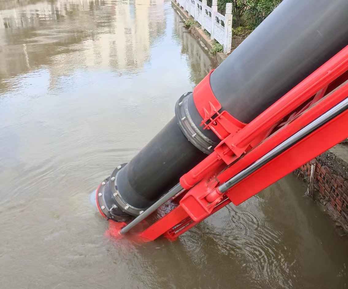 在研判現(xiàn)場情況后,救援人員將垂直式排水搶險車GP35C臂架舉升、越過欄桿,后方水平跨障4m、垂直跨障1.5m,火力全開抽排水,24小時晝夜不停,將三龍支河河道內的水加速排入龍河。截至20日下午五點,GP35C鼓足馬力,平均流量達3000m3/h,兩個出水口各連接60m水帶,共計抽排水27小時,累計排水量超80000m3。