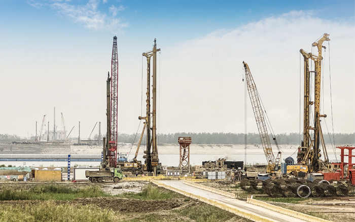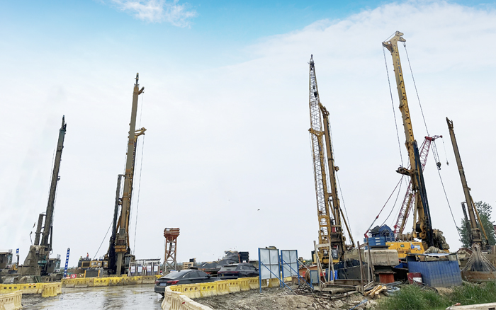 徐工XR550D、XR580HD等多臺徐工大噸位旋挖鉆機(jī)群憑借精湛的技術(shù)和卓越的性能,成功攻克了地層復(fù)雜、工期緊迫等多重難題,平均成孔周期68小時,全面提速大橋樁基礎(chǔ)建設(shè)。