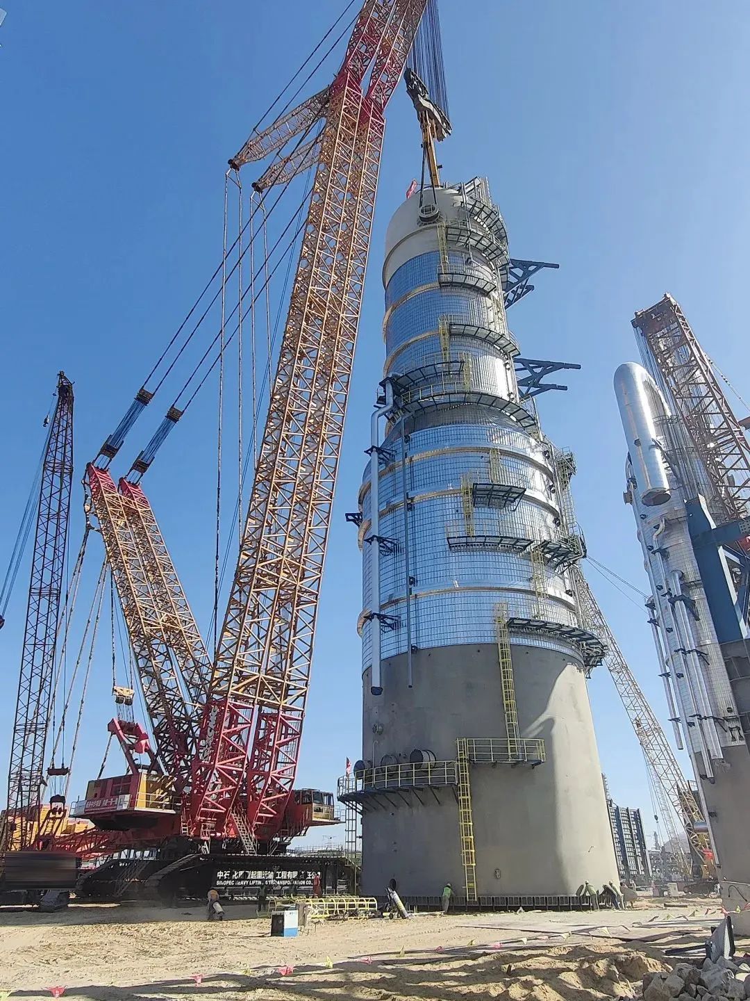 近日,徐工XGC88000(4000噸級(jí))履帶起重機(jī)在我國(guó)華南某大型石化項(xiàng)目現(xiàn)場(chǎng),成功完成重達(dá)2000噸的急冷水塔設(shè)備的吊裝任務(wù)。