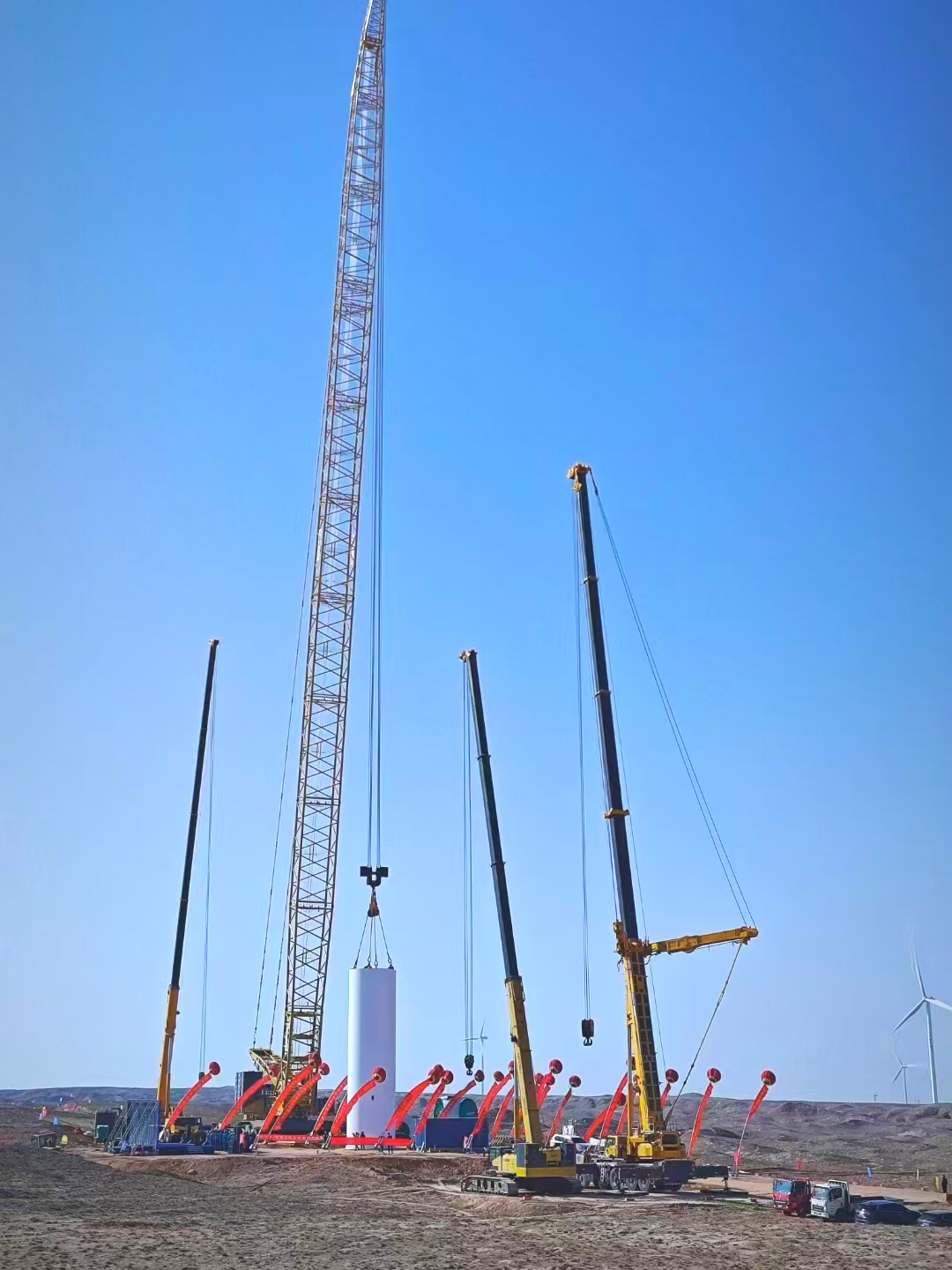 隨著施工號(hào)角吹響,各臺(tái)起重機(jī)緊密配合,XLC18000M采用138+8m的標(biāo)準(zhǔn)風(fēng)電工況,穩(wěn)穩(wěn)將98m長(zhǎng)的葉片與112t重的輪轂、葉片在百米高空精確連接到機(jī)艙,XGTC160-I、XCA600L8 和 XCA200L8_2則靈活調(diào)整位置,輔助完成關(guān)鍵部件的吊裝,整個(gè)吊裝過(guò)程精確無(wú)誤。