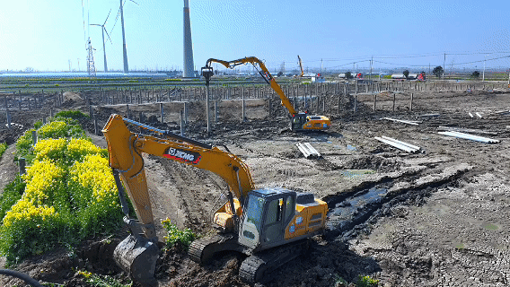 在揚州178兆瓦光伏施工現(xiàn)場,徐工XE300GP打樁機正演繹著現(xiàn)代工程機械的超強實力——機械臂精準(zhǔn)起落間,10米預(yù)制樁以平均57s/根的節(jié)奏植入地層,樁基垂直度監(jiān)測儀實時顯示±5厘米的精度數(shù)據(jù)。