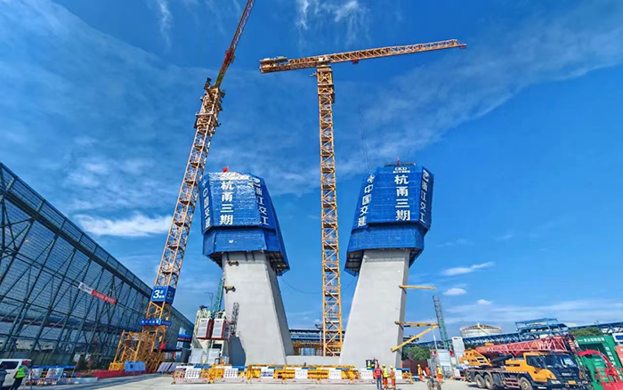 在杭甬復線寧波三期甬江特大橋施工現(xiàn)場,1臺徐工XGT3000-120S、2臺XGT3000-100S如鋼鐵巨人伸展手臂,正加緊進行著鋼筋部品的吊裝,助力3座大橋主塔以平均每天1米的速度向云端挺進,贏得施工方“技術(shù)先進、安全可靠、吊裝能力強、操作平穩(wěn)、智能化水平高、施工效益顯著”的高度肯定。