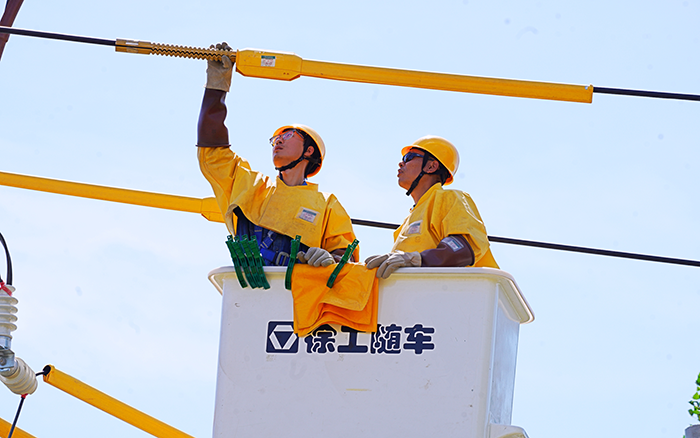 當日,驕陽似火,酷熱難耐,地面溫度高達 40℃。但供電工作人員們毫不退縮,他們爭分奪秒,絕緣手套里的手掌早已被汗水泡得發(fā)白,卻仍穩(wěn)穩(wěn)攥著工具精準操作;斗臂車內(nèi)的溫度計指針不斷攀升,他們卻顧不上擦去汗珠,全神貫注盯著線路接口。為了縮短停電風險窗口,用高效的操作與高溫賽跑,全力保障供電不中斷。徐工 GKJH22A 絕緣斗臂車穩(wěn)穩(wěn)地??吭谧鳂I(yè)點旁,它猶如一位鋼鐵巨人,隨時準備為施工人員提供堅實的保障。