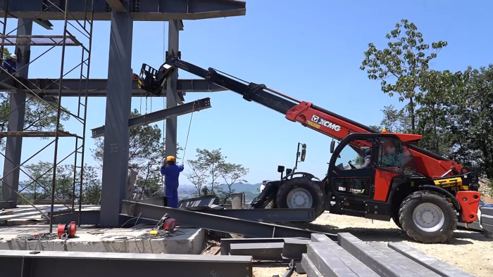 穿過羅峰寺旁的盤山公路,一抹紅色在山野間格外顯眼,徐工伸縮臂叉裝車XT4018K正將重達(dá)2.2噸的結(jié)構(gòu)物料運(yùn)送至14米的高度,全力建設(shè)全鋼結(jié)構(gòu)寺廟。