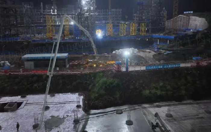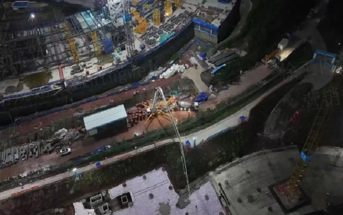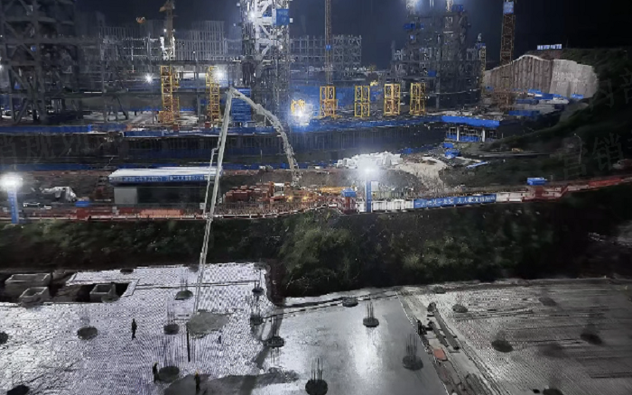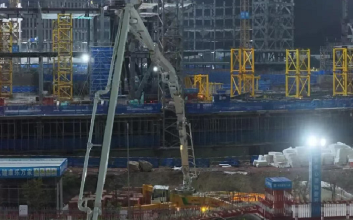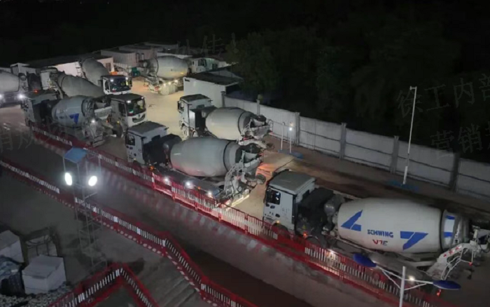 凌晨三點(diǎn)的重慶兩江新區(qū),徐工72米泵車展臂高空,20輛新能源攪拌車穿梭往來(lái)—這不是科幻電影場(chǎng)景,而是徐工混凝土成套化裝備助建重慶賽力斯全球汽車公園的火熱夜戰(zhàn)場(chǎng)面。