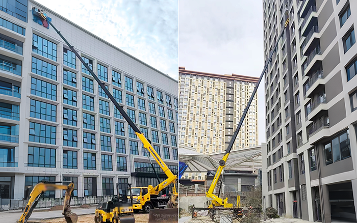 高層樓宇外側(cè)飄窗突出結(jié)構(gòu)密集分布,對高空作業(yè)的精準(zhǔn)度和靈活性要求極高。傳統(tǒng)設(shè)備因臂架笨重、跨障能力弱,難以精準(zhǔn)抵達(dá)作業(yè)點位,施工進(jìn)度頻頻受阻。而徐工 GKS45A 搭載“基本臂 + 六節(jié)伸縮臂 + 獨立飛臂” 創(chuàng)新結(jié)構(gòu),緊湊靈動的小飛臂如同精準(zhǔn)的 “高空畫筆”,輕松繞開各類障礙物,穩(wěn)穩(wěn)定格每一個作業(yè)位置,完美匹配新樓施工的嚴(yán)苛需求。