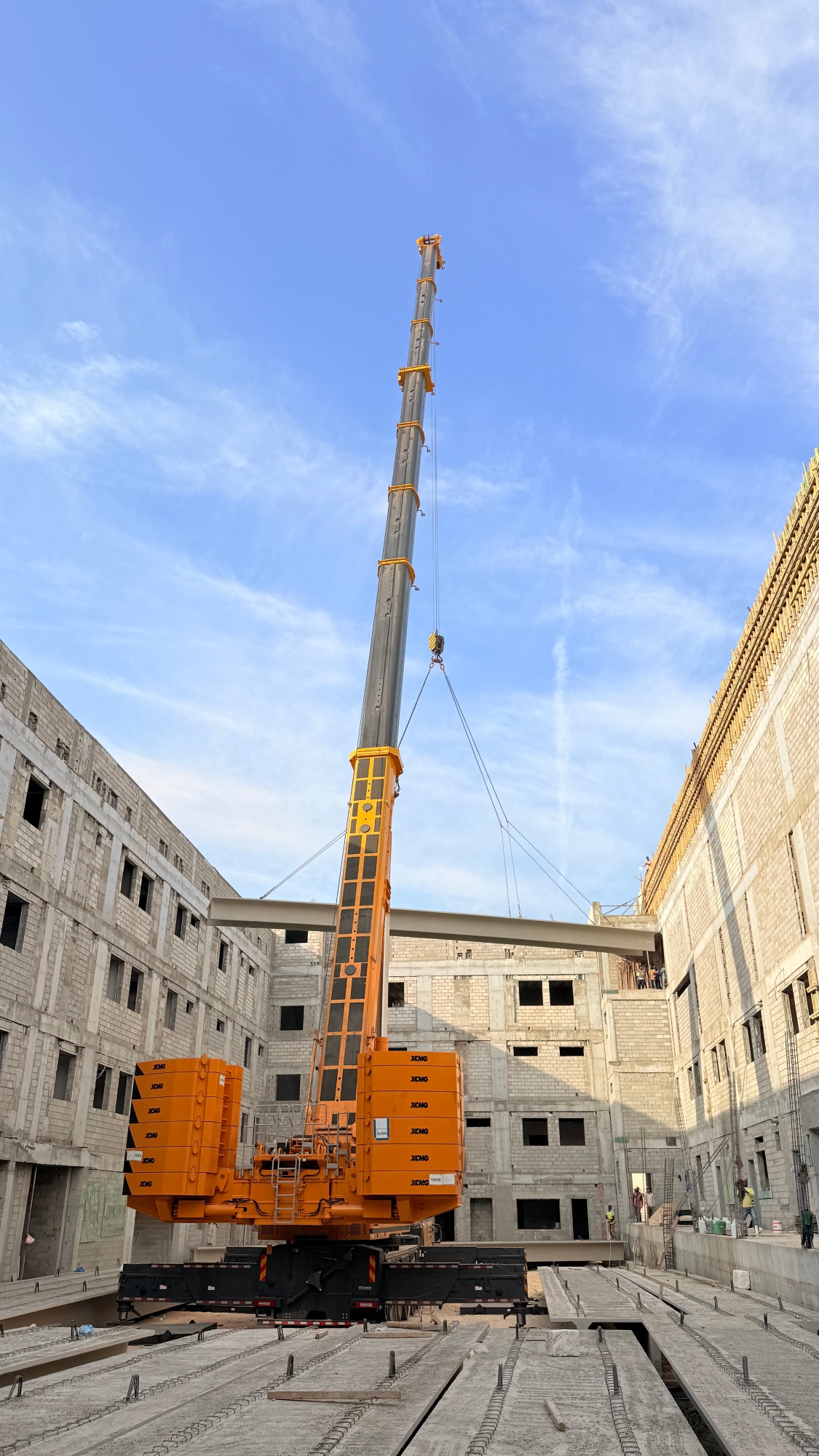 此次施工位于沙特快速發(fā)展的都市區(qū)域,項目本身對工期與精度有著嚴苛要求。高層建筑的樓板吊裝,尤其是對于重量超過十噸的大型預制構件,不僅是對起重機極限載荷能力的考驗,更涉及在復雜城市空間中的微動操作、抗風穩(wěn)定及高空精準就位等一系列高技術要求?,F場空間有限,周邊環(huán)境復雜,對設備的機動性、站位適應性以及操控的精細度提出了全方位挑戰(zhàn)。